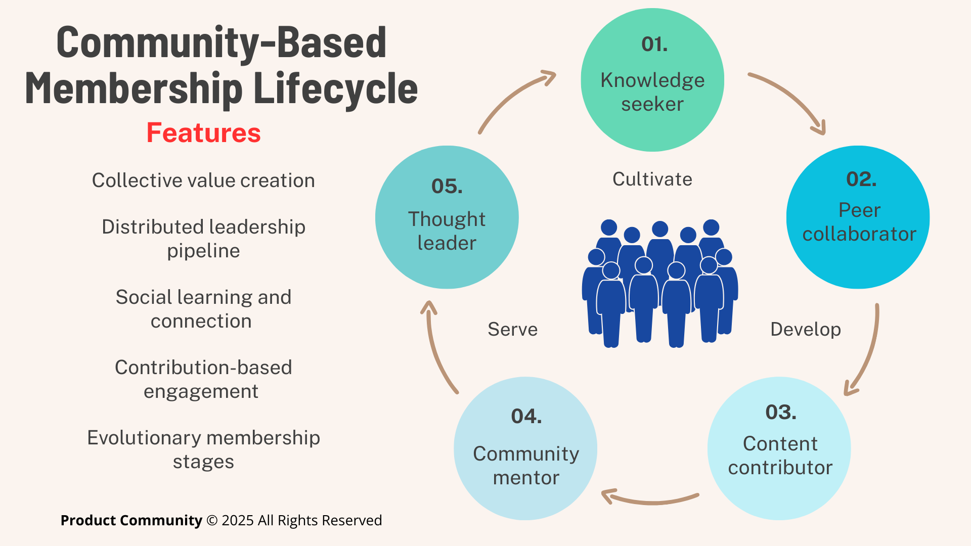 In contrast, a community-based approach views the membership lifecycle as a dynamic ecosystem where members progress through deepening levels of contribution and connection. Rather than simply consuming organizational offerings, members become co-creators of value, knowledge, and community culture from the earliest stages of their involvement.