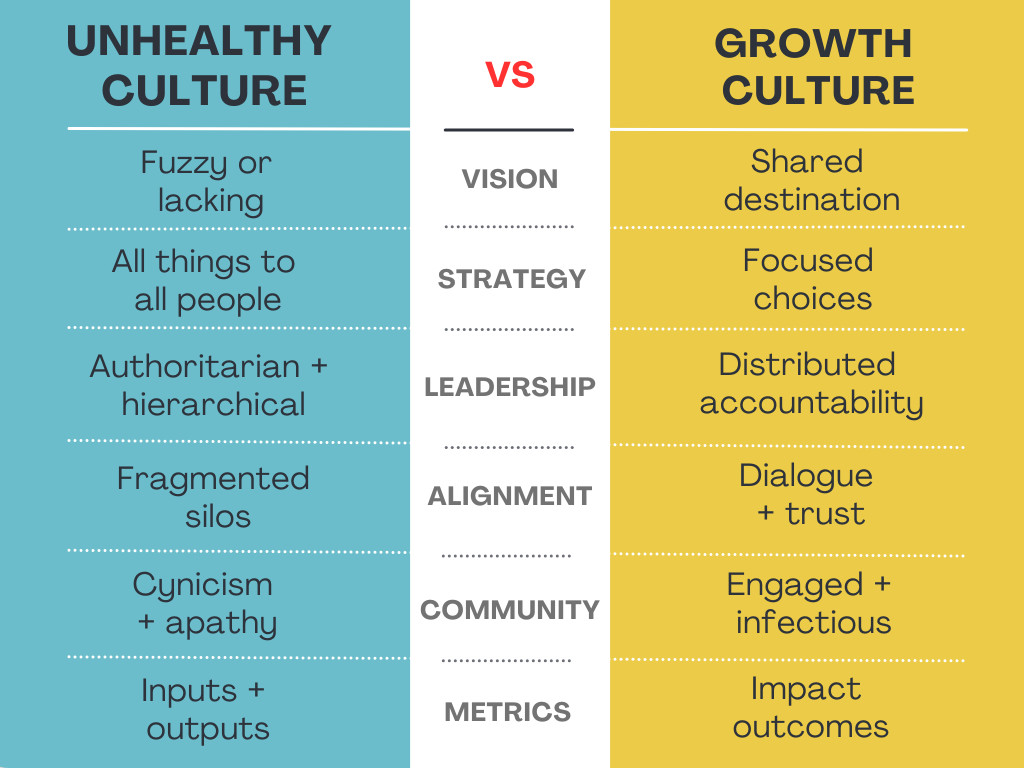 Culture can be tricky. It can be difficult to accurately diagnose and can be tough to change. Good ideas can be crushed by a dysfunctional organizational culture, negative team vibe, or a critical mass of staff or volunteers who resist change. An uneven culture might result in factions of resentment or back channels of negativity.